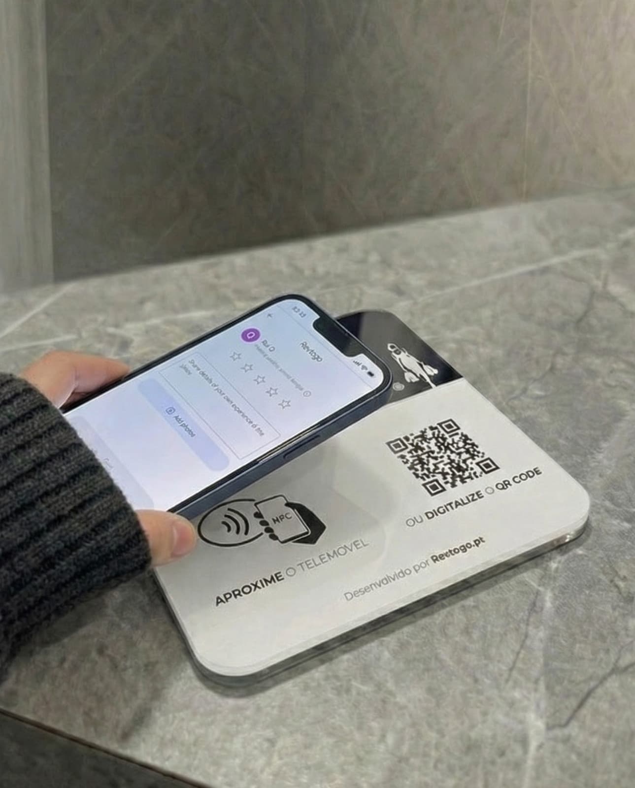 O cliente aproxima o telemóvel da placa e é redirecionado diretamente para a página de avaliação do Google, onde pode deixar a sua opinião de forma simples e imediata.